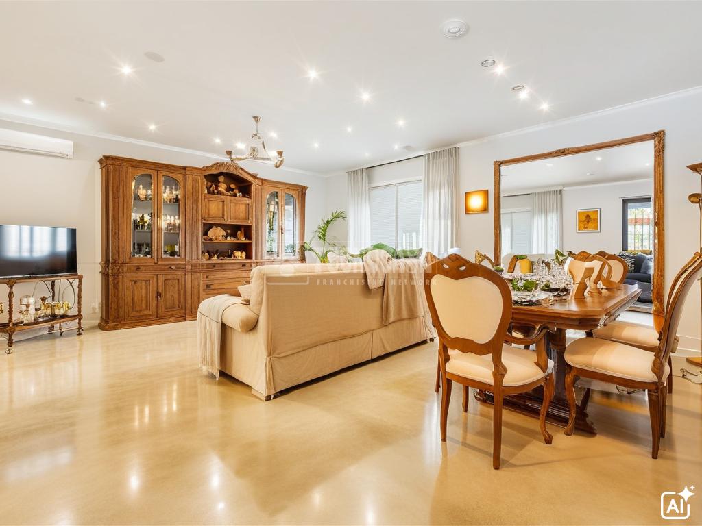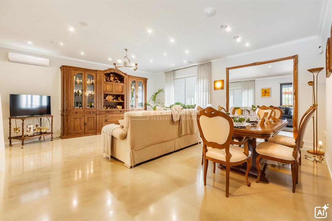 Avanzando por el distribuidor, accedemos a un amplio salón-comedor de 30,27 m². Este espacio se encuentra claramente dividido en dos zonas: una para el descanso y otra para el comedor, con salida directa a un porche y al gran patio trasero, lo que amplía la sensación de amplitud y conexión con el exterior.